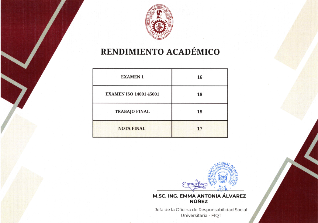 Al haber aprobado el curso con un promedio ponderado mayor ó igual a 12, se le otorga al participante un certificado a nombre de la Universidad Nacional de Ingeniería – Facultad de Ingenieria Quimica y Textil.
