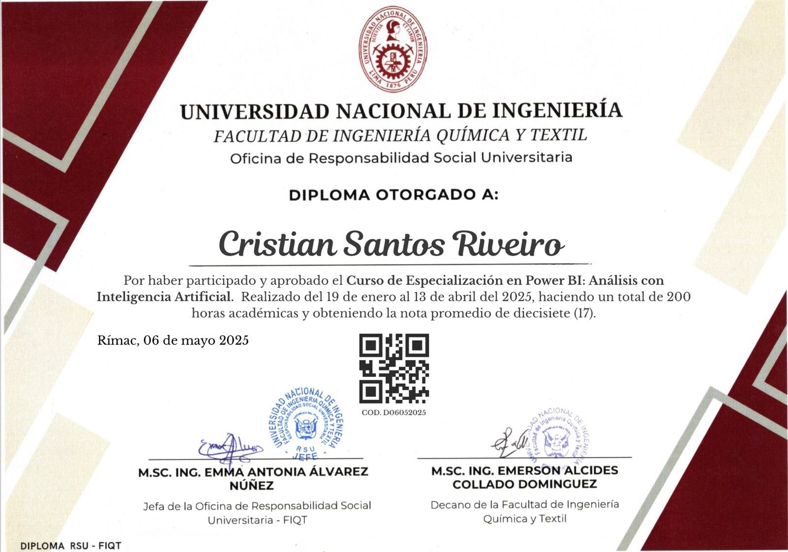 Al haber aprobado el curso con un promedio ponderado mayor ó igual a 12, se le otorga al participante un certificado a nombre de la Universidad Nacional de Ingeniería – Facultad de Ingenieria Quimica y Textil.